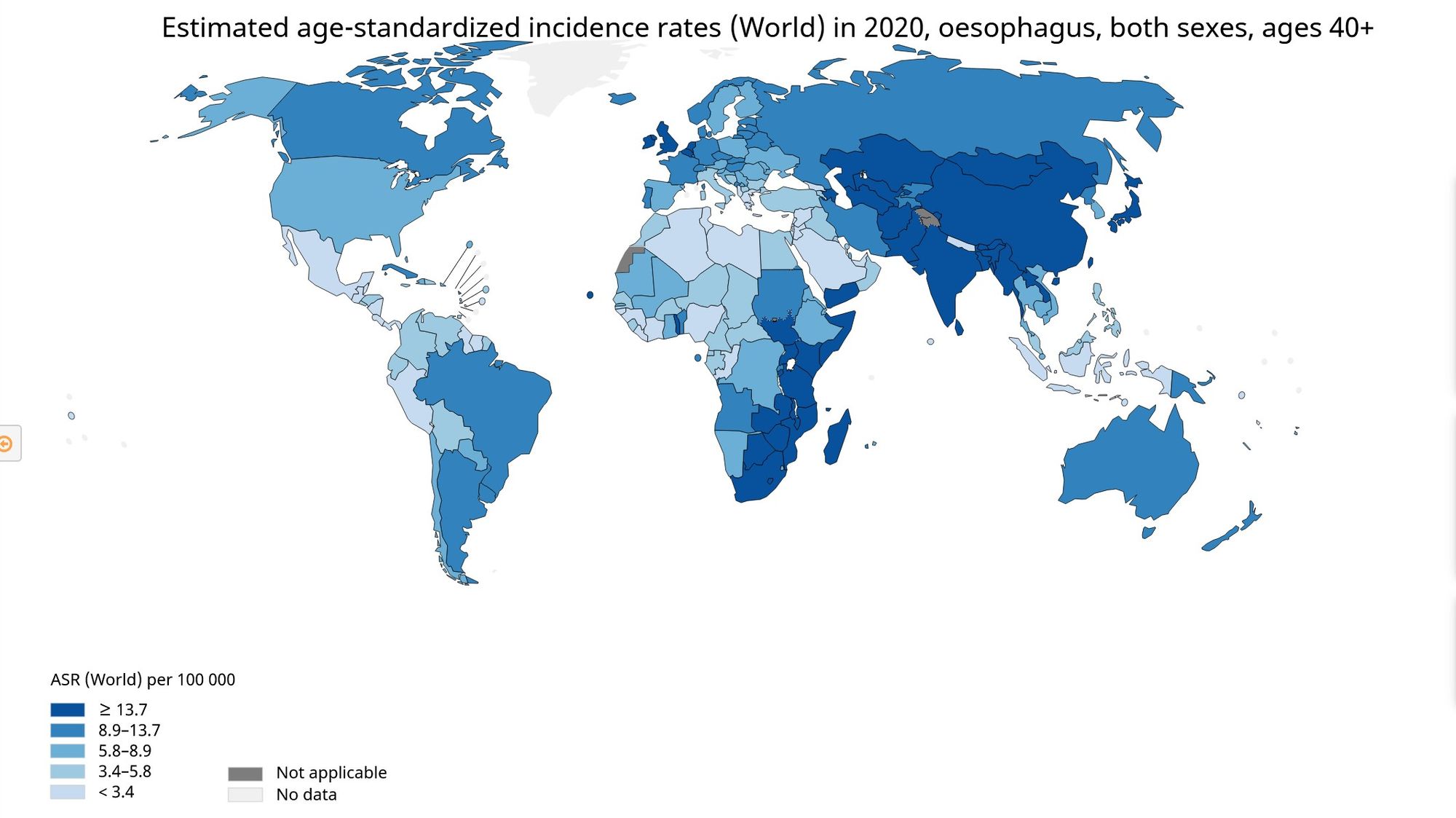 The International Agency for Research on Cancer (IARC) estimates that 604,100 new cases of esophageal cancer occurred worldwide in 2020, making it the seventh most commonly occurring cancer and the sixth most common cause of cancer death.(1) Of these cases, an estimated 15% were EAC, 84% ESCC and the remainder rare histologic types.(2) Esophageal cancer of both types generally occurs more often in men than in women, although the ratio varies substantially by country (figure 3).(1)
