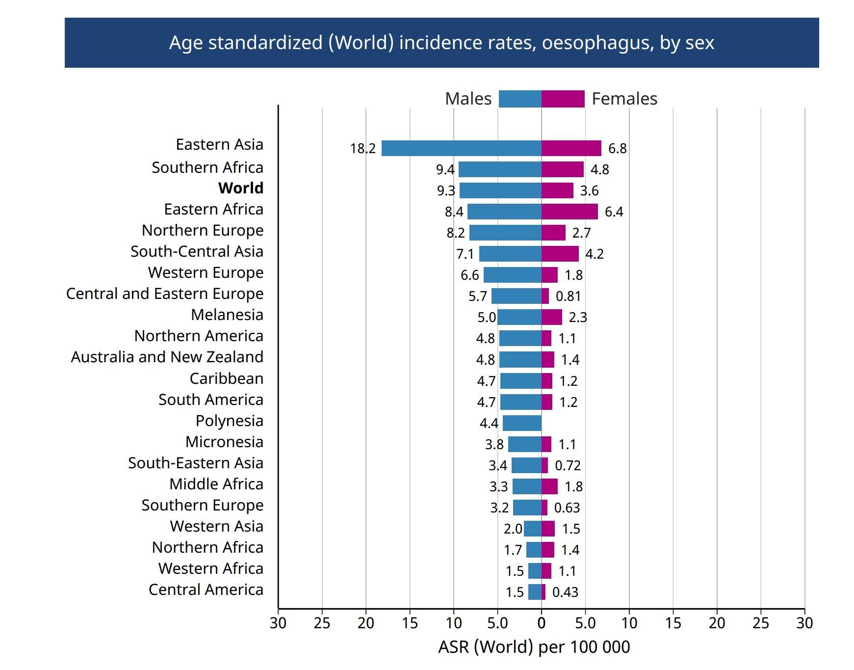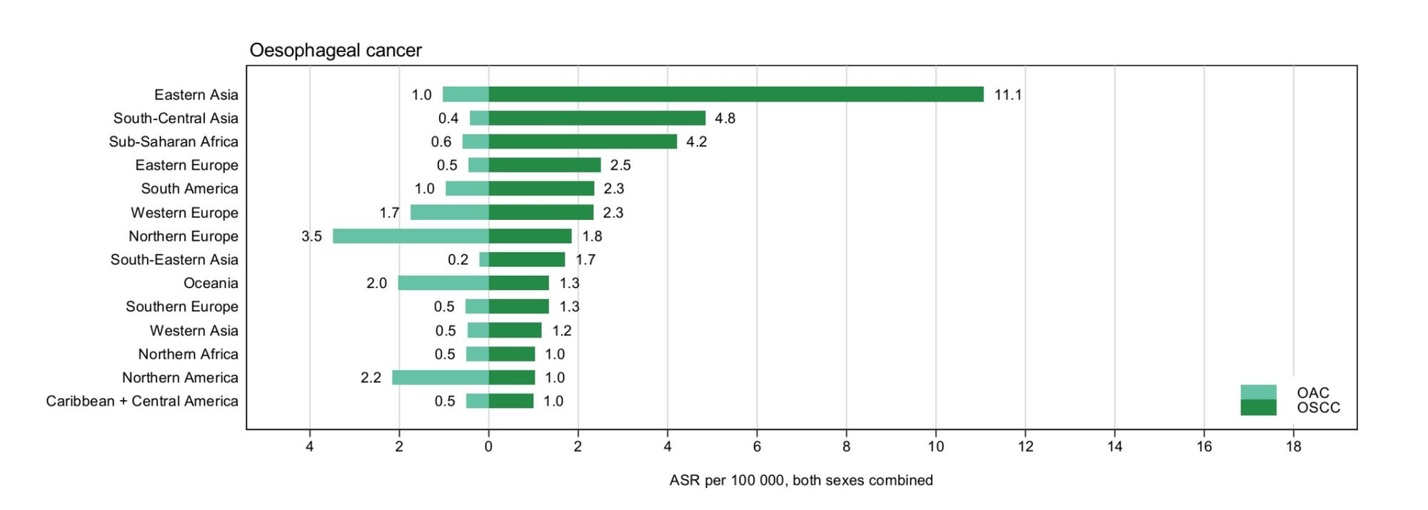 In less developed regions, ESCC is by far the most common histological type. Particularly high rates occur in parts of China, Central Asia and Eastern Africa (figure 2.) In contrast, the United States and much of Western Europe and Australia has seen a remarkable rise in the incidence of EAC which has transformed it from a relative rarity in the 1970s to the most common histological type of esophageal cancer in the U.S. today.(3-6) The age-standardized incidence rates of EAC and ESCC by world region are summarized in Figure 4 (2).