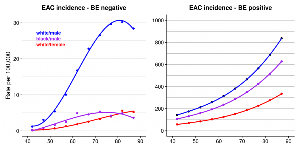 EAC is particularly common among white males, in whom incidence has increased about 10-fold in the U.S. since the early 1970s.(7) Incidence rates in other groups also have risen, although from a much lower baseline rate. Like many solid tumors, EAC incidence rises rapidly with age (figure 5, left graph.) Persons diagnosed with Barrett’s esophagus are substantially more likely (about 20-fold at 60 years of age) to develop EAC than the general population (figure 5, right graph.)(8)