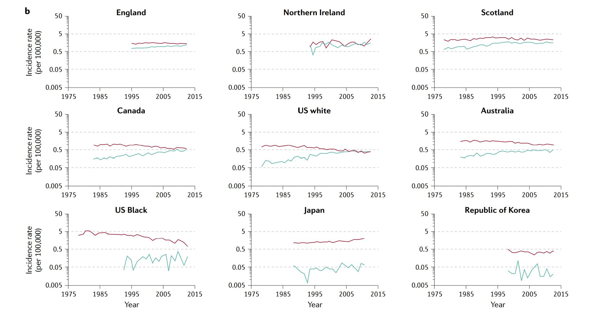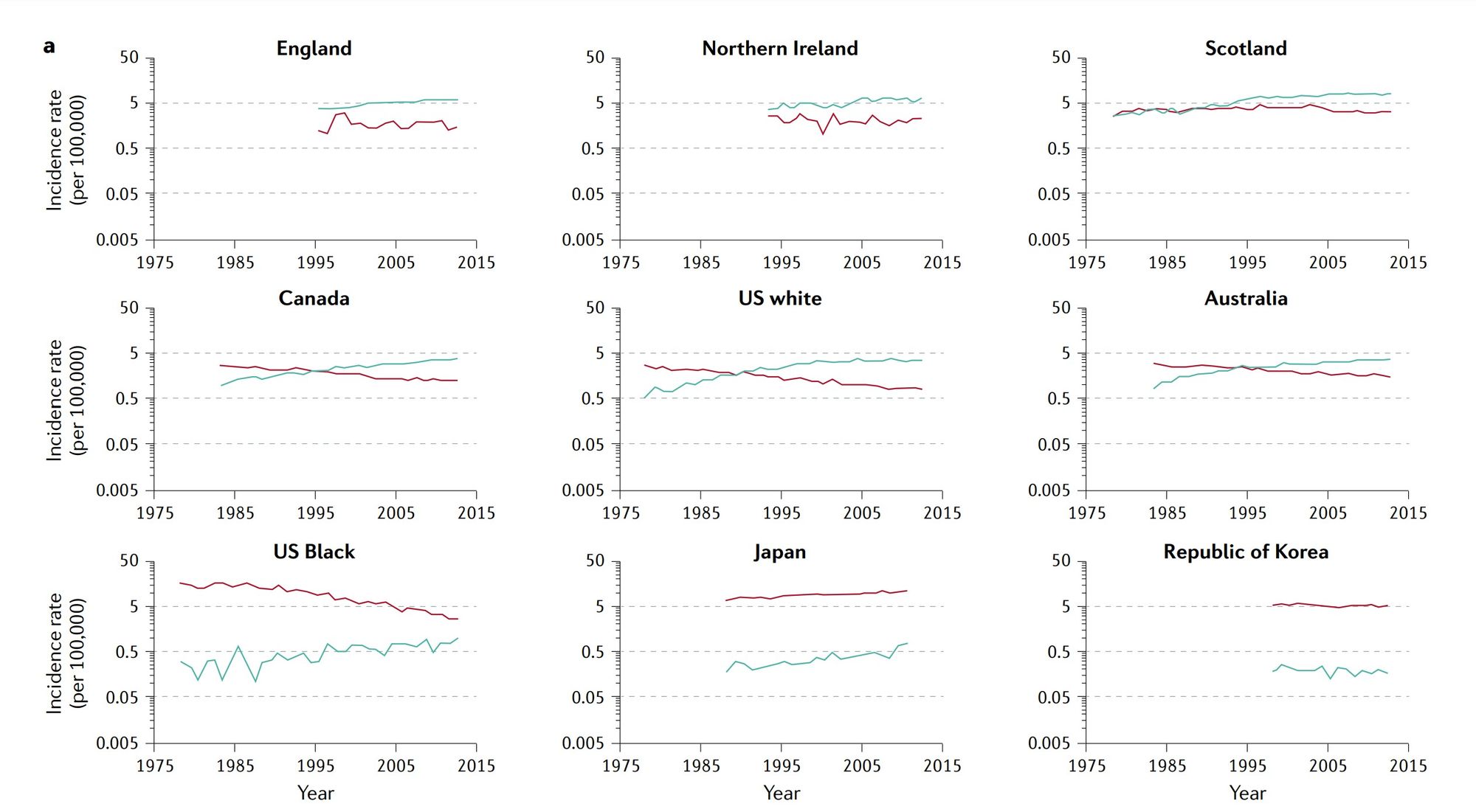 Both absolute incidence rates and time trends vary considerably by world region and by country within regions (figure 6) (9). Among the countries with longer-term cancer registries, including the U.S., Canada, Australia and Scotland, EAC became the most common type in white males all at about the same time - the mid 1990s. In contrast, this "crossing of the lines" is occurring about 20 years later among white females. Incidence of ESCC among males has generally declined in most regions of the world, whereas incidence among females has been stable or even increased in some regions.(10)